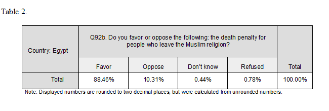 - 88% of Egyptian Muslims favored the death penalty for apostasy.