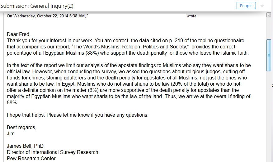 There has been much confusion in the popular media and in internet discussions about Pew's (2013) apostasy numbers. To help clear things up, I point to evidence from the Complete Report and other Pew documents that indicates that the data on p. 219 are from the overall samples of Muslims in each country.[Appendix I] To provide verification, I contacted the primary researcher of this (2013) study, who confirmed that 88% of Egyptian Muslims favored the death penalty for apostasy, and that the apostasy question was asked of all Muslims surveyed in the countries on p. 219.[Appendix II]